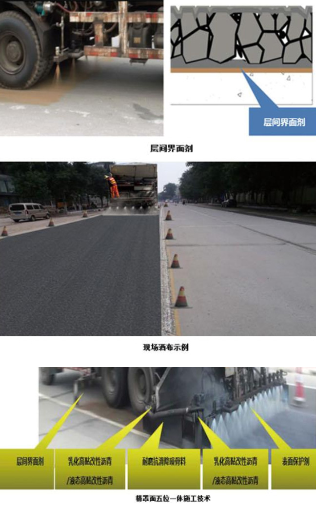 低噪抗滑功能復合型精罩面技術,簡稱精罩面技術。該技術是將層間界面劑、熱塑反應型復合改性乳化瀝青、耐磨抗滑降噪骨料、表面保護劑等通過專用設備同步施工到原路面,形成的路面養(yǎng)護結構層。
