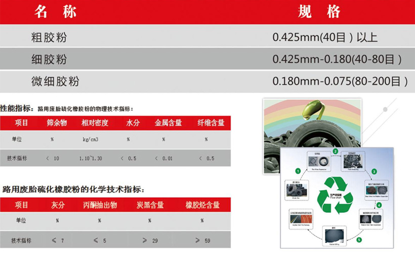 該產品針對國內膠粉來源變異性大,行業不規范的不足,采用穩定的高品質胎源及分類分揀的技術手段,生產出性能穩定,雜質含量低的高品質硫化橡膠粉。產品符合JT/T 797-2011《路用廢胎硫化橡膠粉》